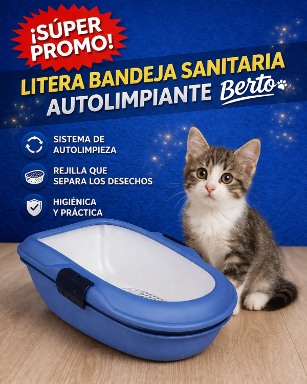 Bandeja Higiénica Berto Autolimpiante - Medidas: 39 × 22 × 59 cm - Compuesta por 3 partes: * 2 bandejas inferiores. * 1 tamiz para una limpieza sencilla. - El borde doble previene salidas de arena y orina. - Los clips permiten una apertura y cierre sencillos para la limpieza. - Reduce el consumo de lecho Los gatos son animales con un alto sentido de la limpieza, y es esencial proporcionarles las condiciones adecuadas para su higiene. Se aconseja disponer de varias bandejas sanitarias en distintos lugares de la casa para facilitar la adaptación de gatos jóvenes. Conforme el gato se habitúa, se puede disminuir el número de bandejas. Se recomienda mantener una bandeja por cada gato en el hogar y no ubicarlas cerca de sus áreas de alimentación.