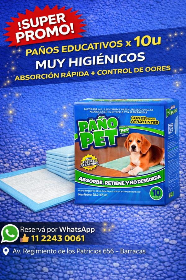 Pañopet COMPACT son alfombras sanitarias DESECHABLES para perros y gatos, ideales para educarlos en su higiene. Con esencias atrayentes similares a feromonas caninas, atraen a la mascota a orinar en ellas. Retienen líquidos, minimizan olores y son hipoalergénicas. Su fórmula única con gel súper absorbente y pulpa de celulosa las hace más esponjosas y cómodas para la mascota